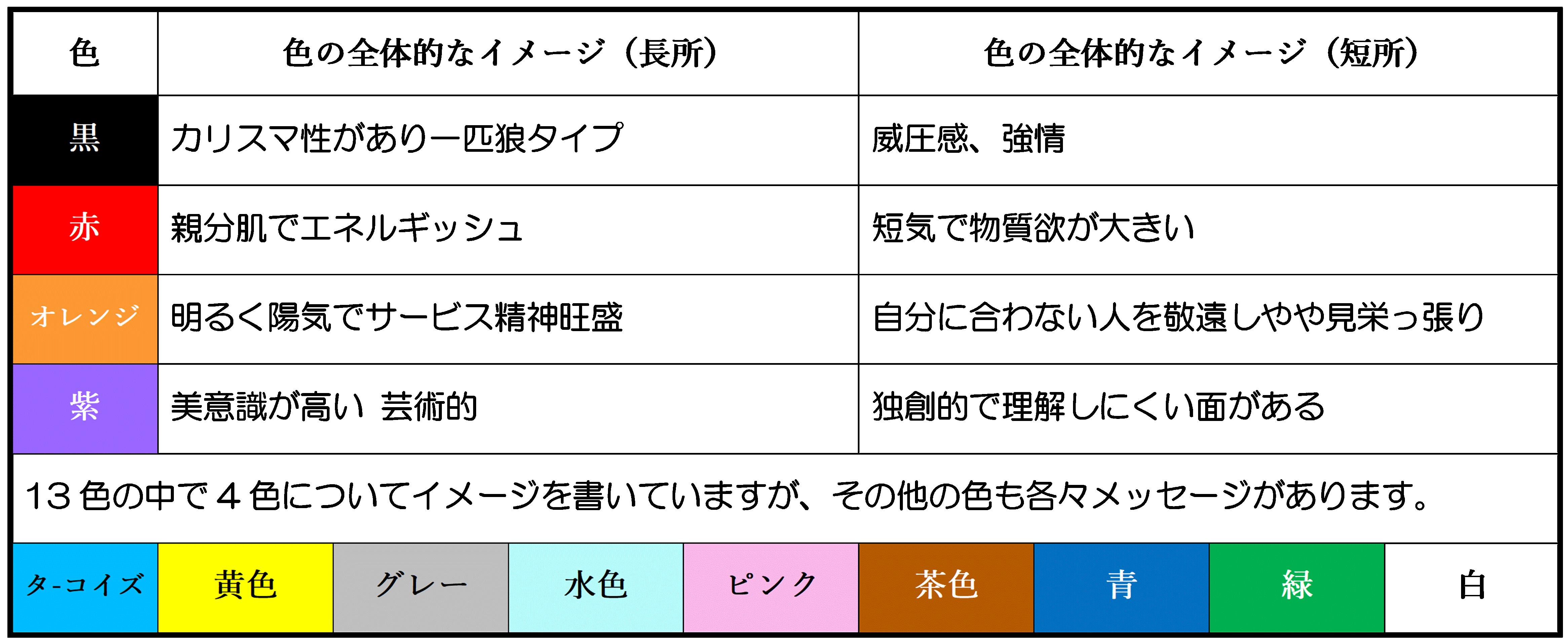 たった4色の説明ですが、残り11色もとても面白く興味深く 相手の持ち物の色からその人の性格判断が出来たり、自己アピールに有効な色を使ったり 「色」は日常の様々なシーンで活かすことが出来ます。 パーソナルカラー 骨格診断 トップへ