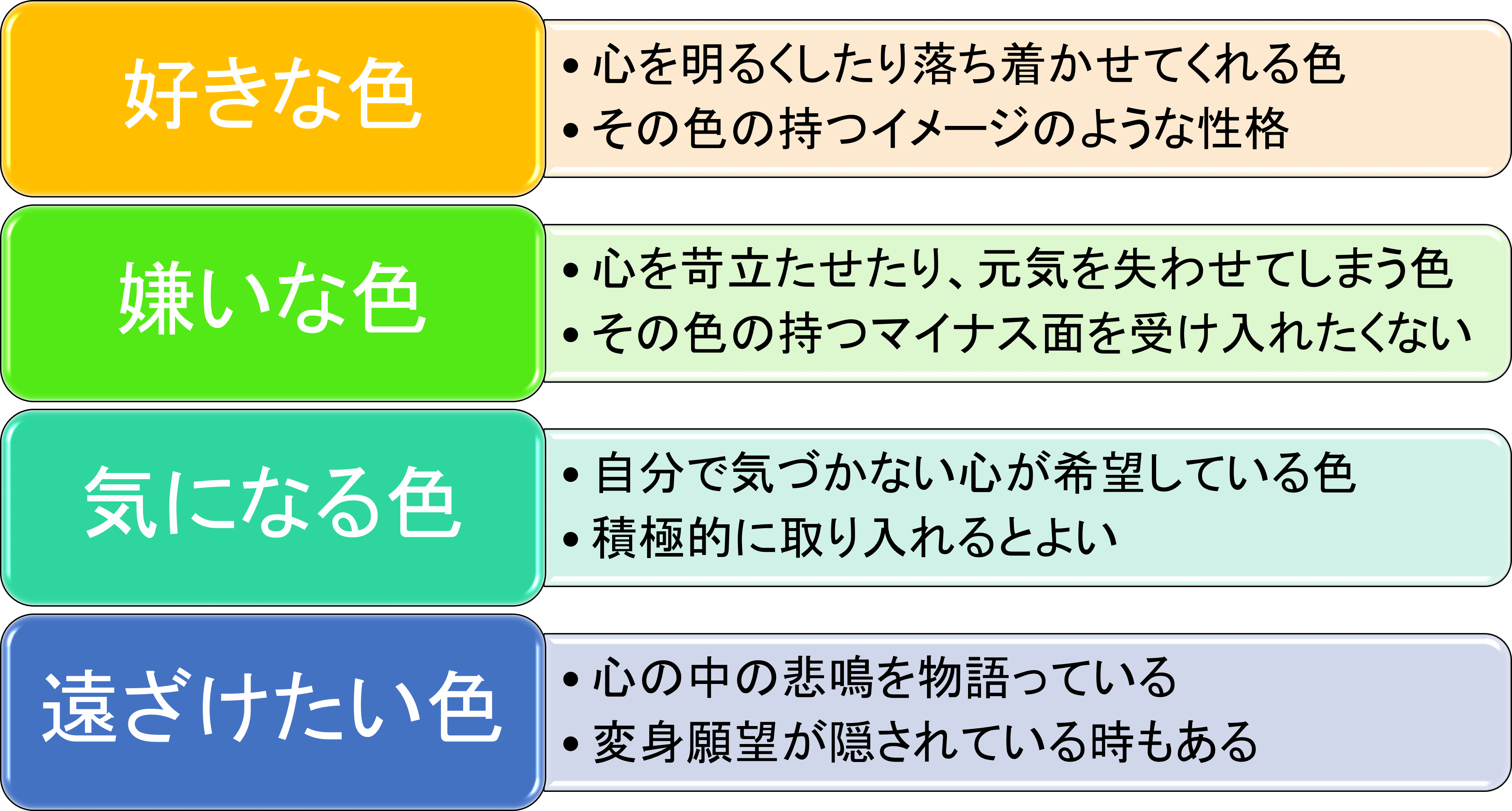 誰にも好きな色や嫌いな色はあると思いますが、その理由を考えてみませんか? 自分の心の中を覗くときっといろいろな発見があります。 万人に共通し、青色は安心感を与えるメッセージ性があります。 踏切や電車のホームの色を「青色灯」にしたところ事故が大幅に減ったそうです。 色の心理効果を、生活や仕事にうまく活用するご提案をしていきます。 カラーセラピー 色彩心理 外面カラー